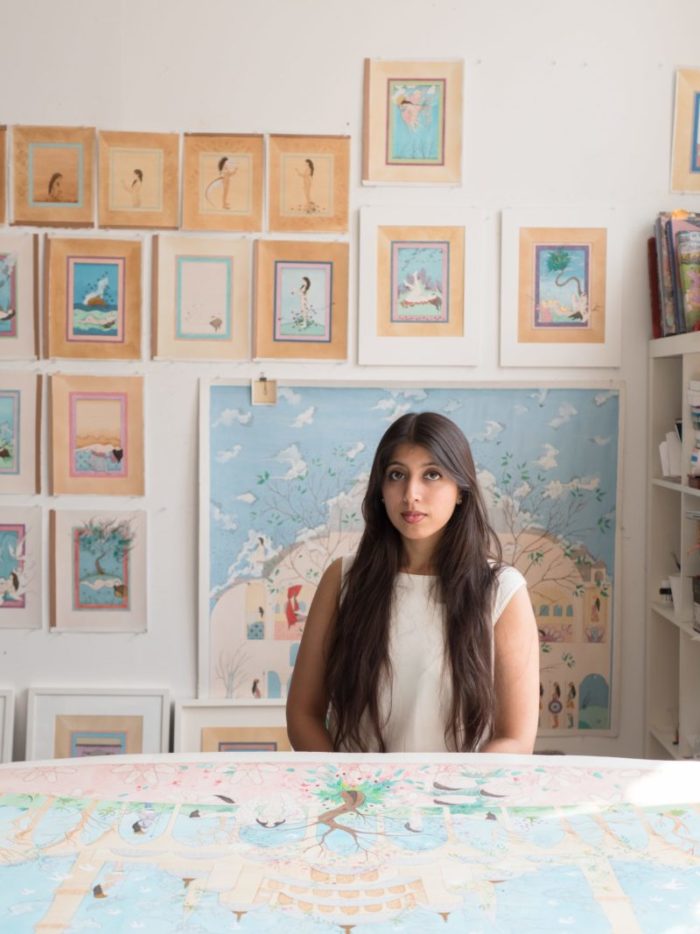 When I met the art of Hiba Schahbaz, my longing for the magic of becoming a long-haired, bare breasted, shimmeringly iridescent half fish snapped me into a nostalgia so heavy I could barely breathe, as if I was underwater with the creatures she depicts. Indiana is land-locked; the thought of sea beasts but a myth there. Karachi, where Hiba grew up in Pakistan, sits on the Arabian Sea. Coming back to Karachi is like stepping into the sea again after months on land. How easily you float, how peaceful is the sense of being borne along, and how familiar the sound of the water lapping against your limbs, writes one of Pakistan’s greatest authors, Kamala Shamsie. She makes it sound so safe, and Hiba’s mermaids look so protected, their hair insouciantly covering their naked breasts, as if they are viewed only from within a bubble of security. She doesn’t paint them as if she’s a man, peering voyeuristically into their cozy world. She paints them as if she, too, is interested in preserving their security, in respecting their comfort.