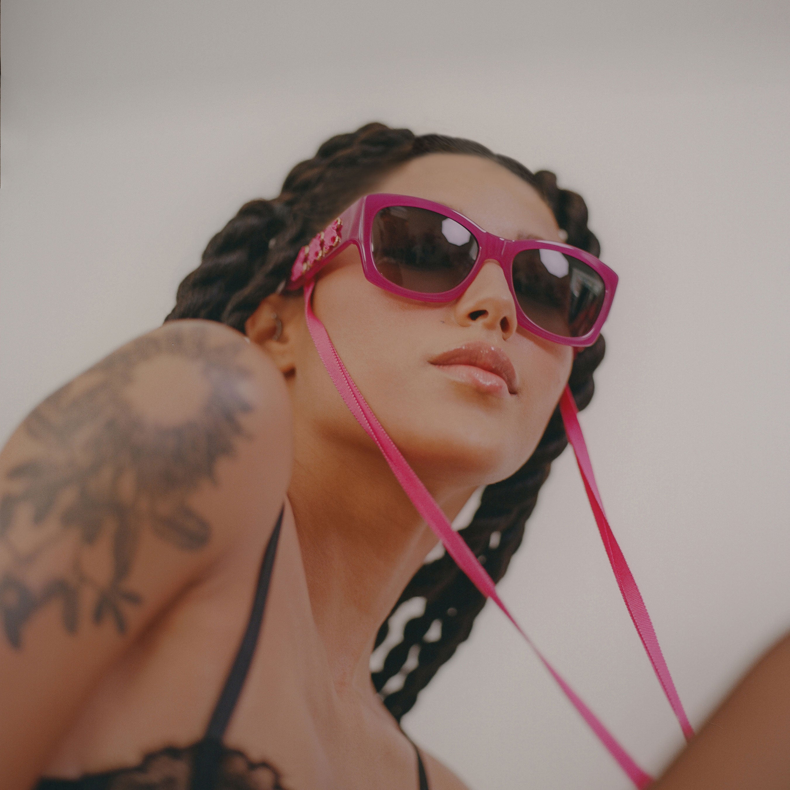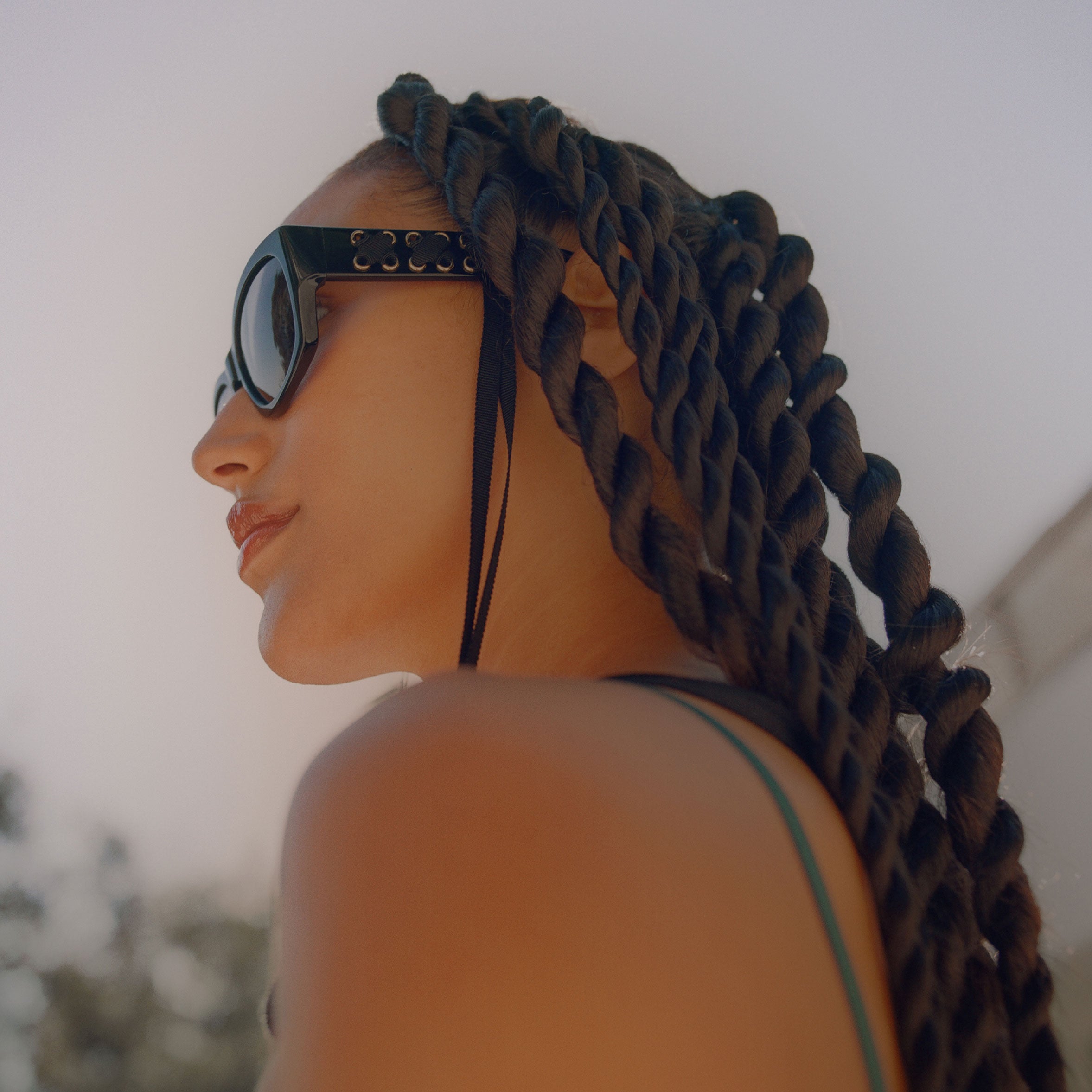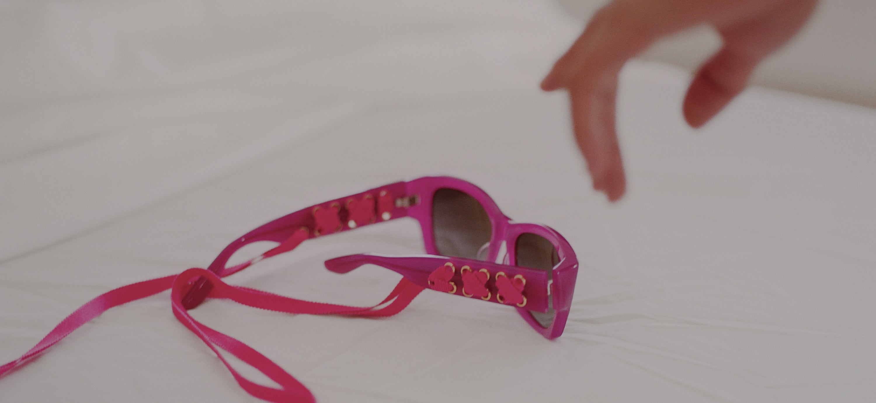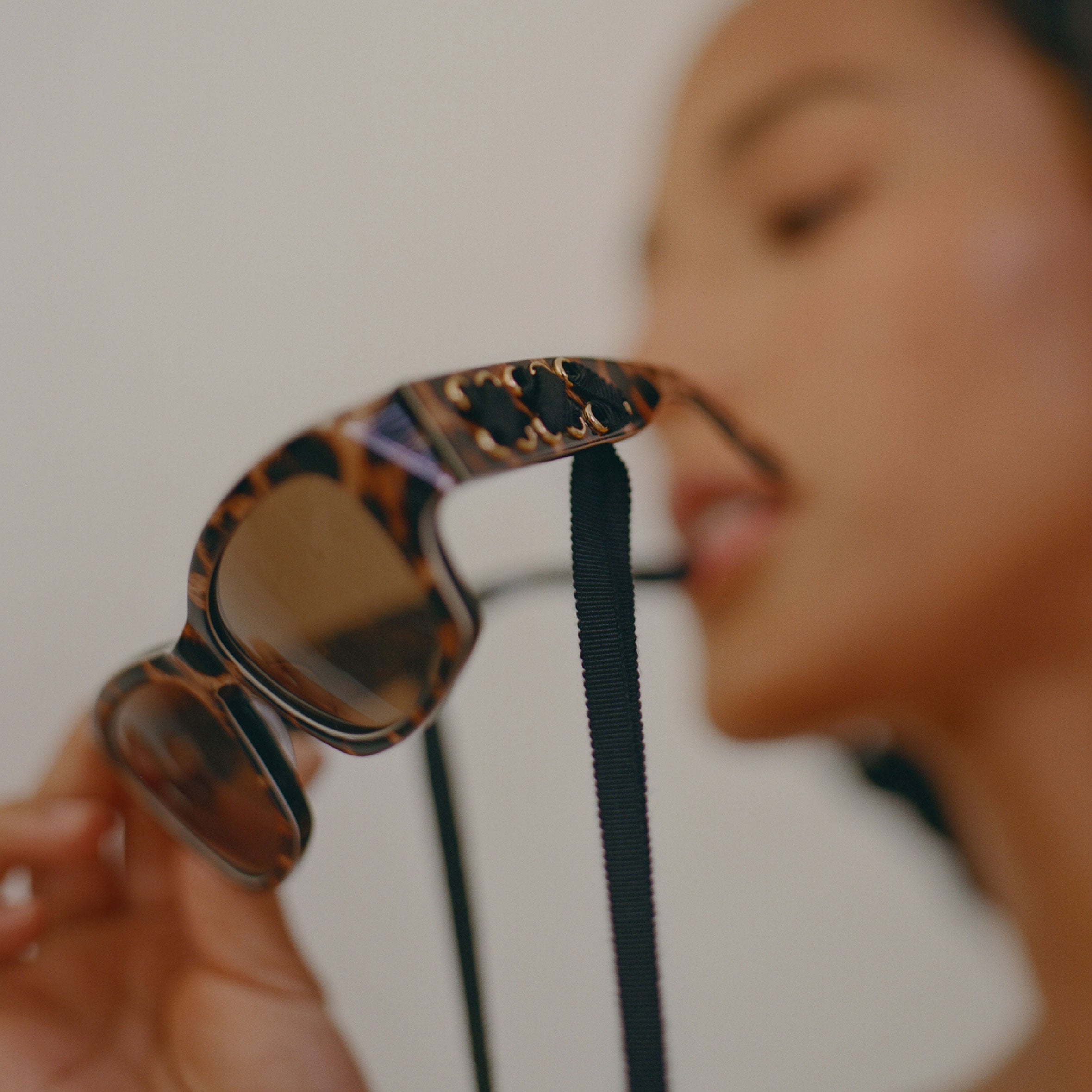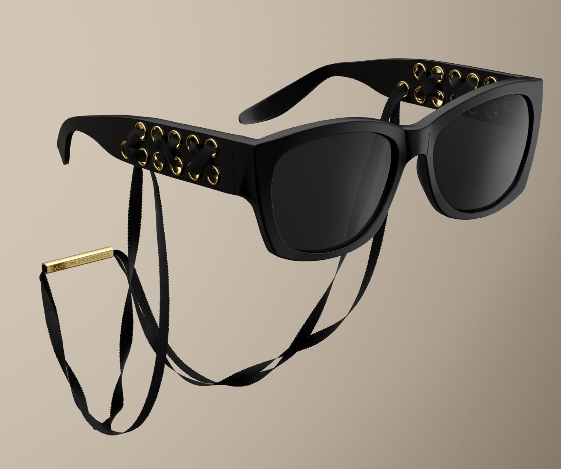 The Cora embodies a rebellious, decadent, and glamorous spirit. Its refined wrap silhouette sunglass is constructed with Barton Perreira’s signature Japanese acetate and is available in sumptuous shades of blue, pink, ivory, black, and leopard print. The corset influence is prevalent in the unique, oversized temples, which feature interwoven grosgrain silk ribbons connected by a 24K gold logo-plated bead and detailing, allowing for the sunglasses to drape around the neck.