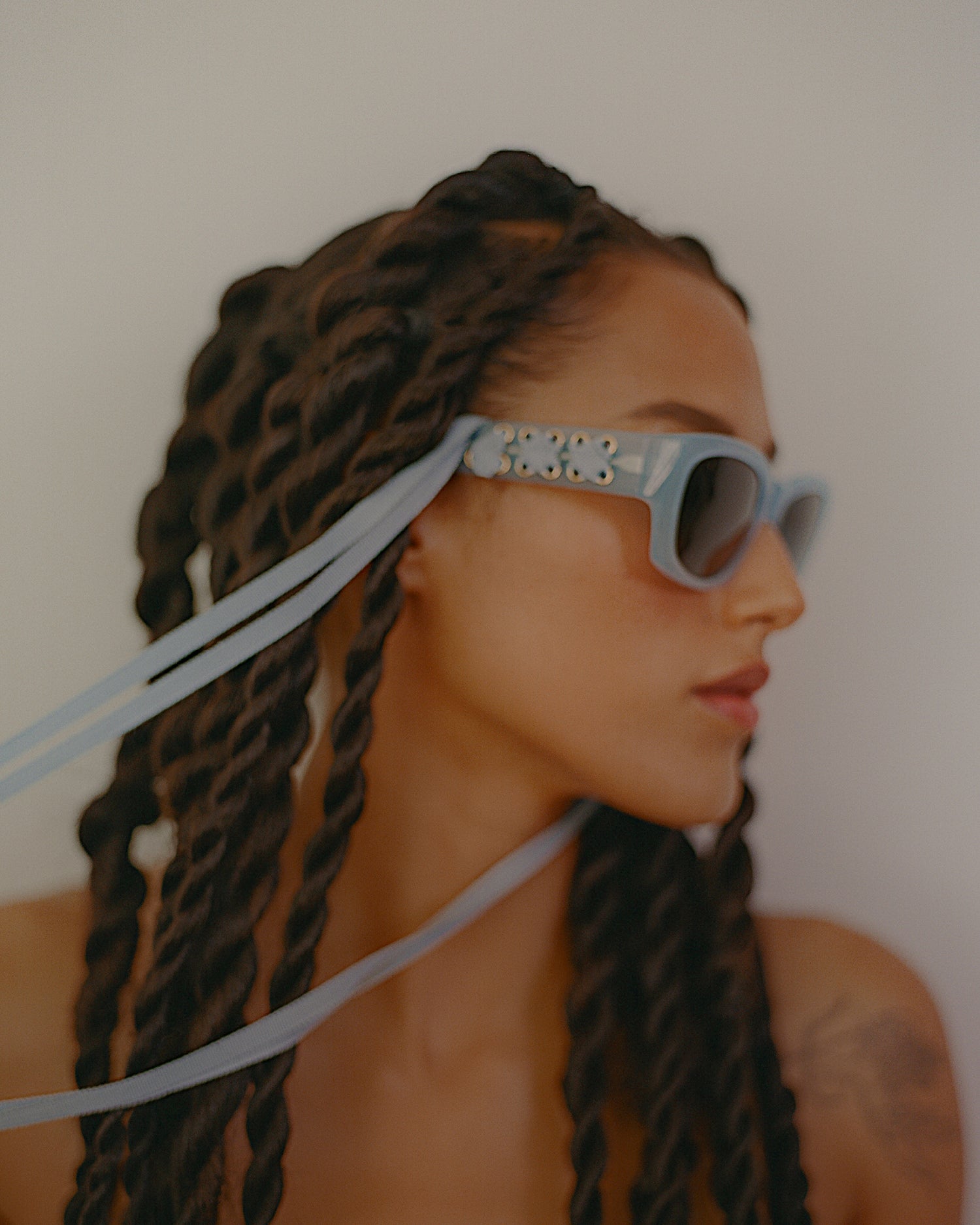 Patty Perreira presents her limited-edition sunglasses destined to become the centerpiece of any eyewear collection. The Cora embodies a rebellious, decadent, and glamorous spirit. Its refined wrap silhouette is constructed with Barton Perreira's signature Japanese acetate. The corset influence is prevalent in the unique, oversized temples, which feature interwoven grosgrain silk ribbons connected by a 24K gold logo plated bead allowing for the sunglasses to drape around the neck.