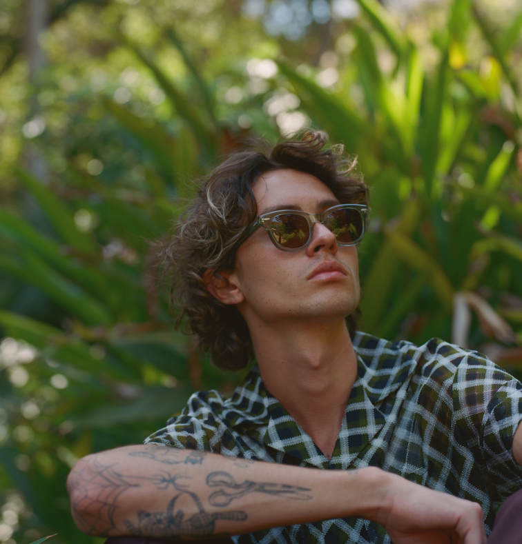 The effortless balance of modern design and vintage cool. Crafted in polished acetate and adorned with our signature hinge metal plaques. Available in sun and optical.