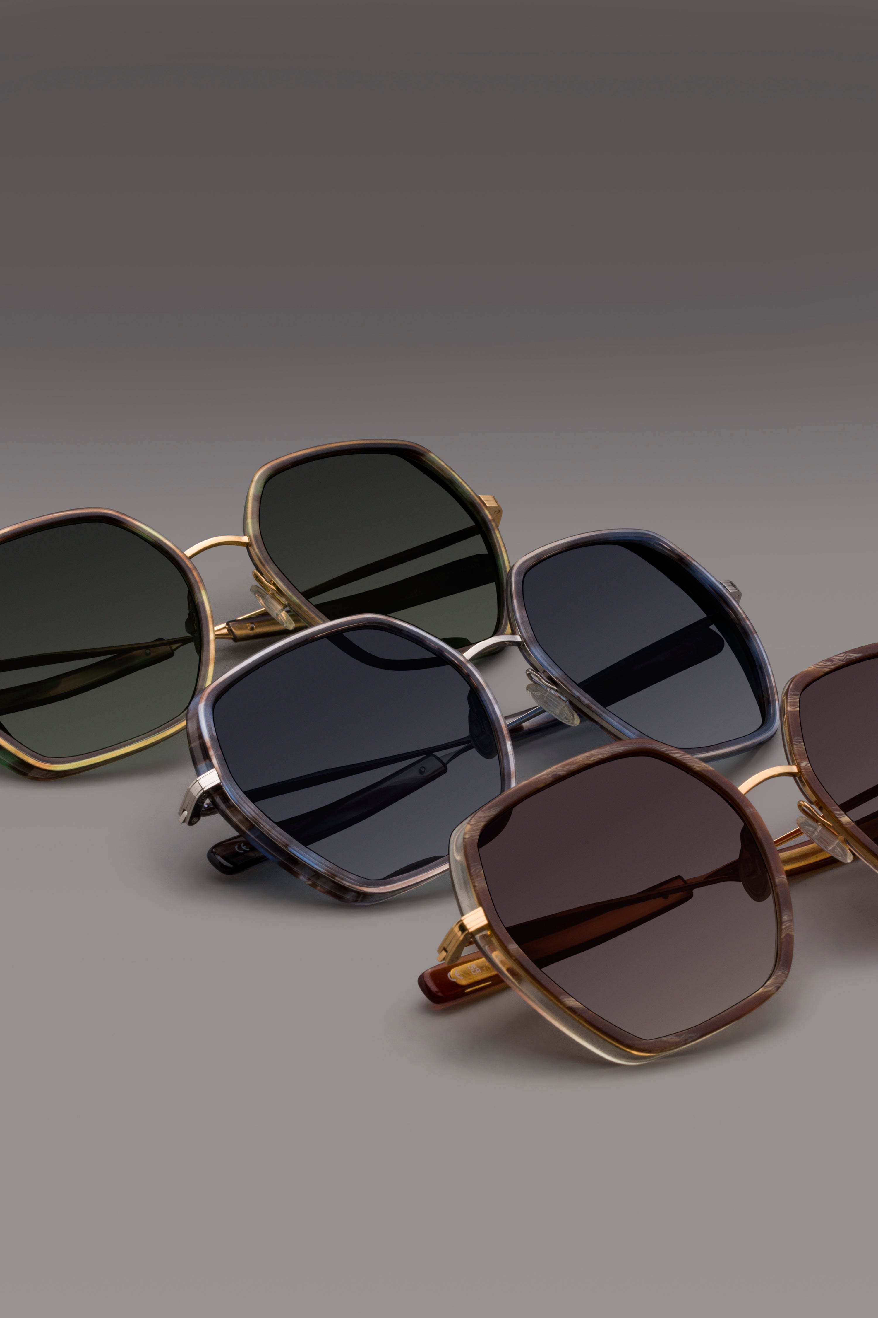 This refined sunglass highlights architectural angles featuring titanium eyewire paired with Japanese acetate. The colors draw inspiration from the captivating beauty of landscapes and seascapes while jewelry-inspired filigree details revealed through the paddle temple highlight the interplay of materials.