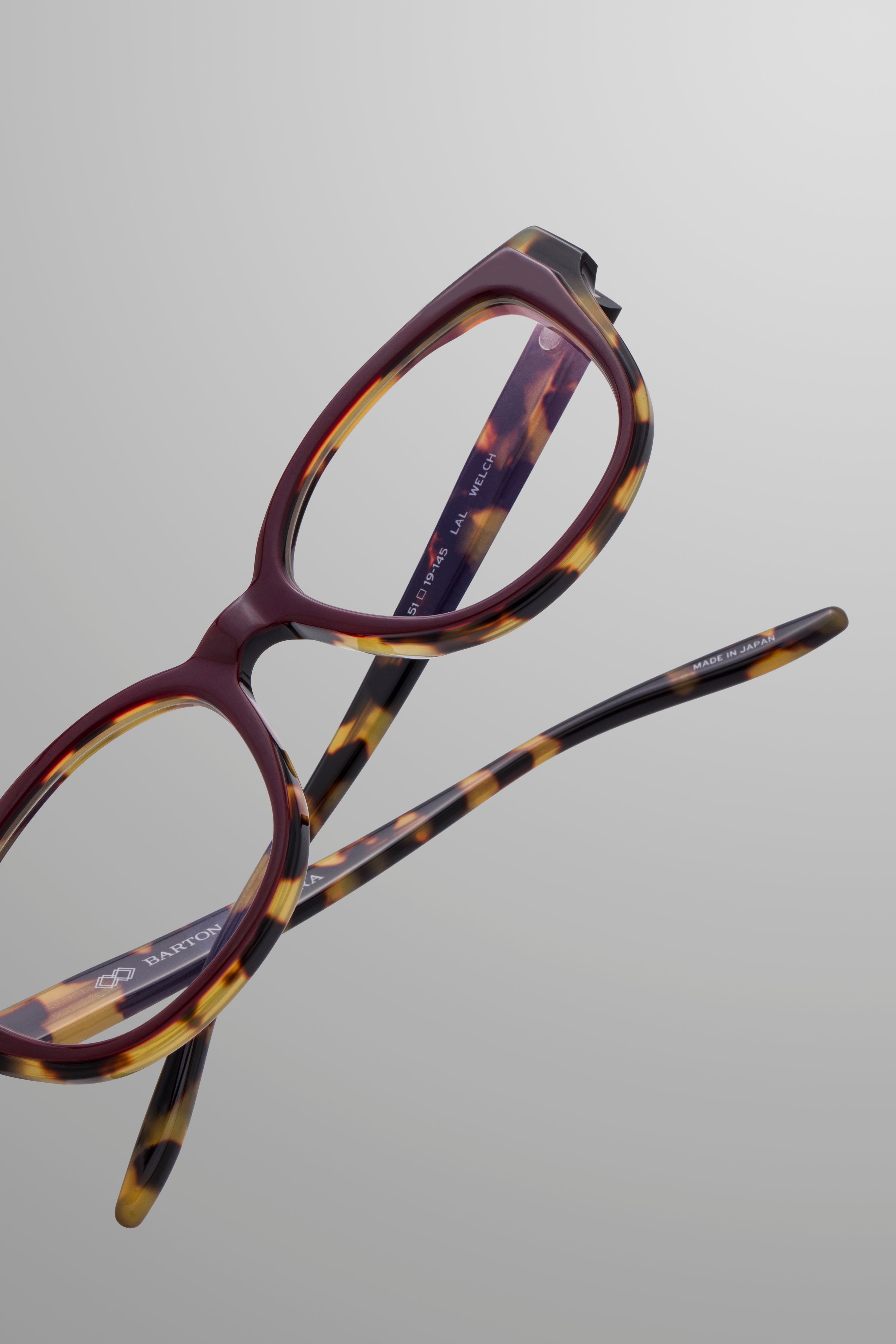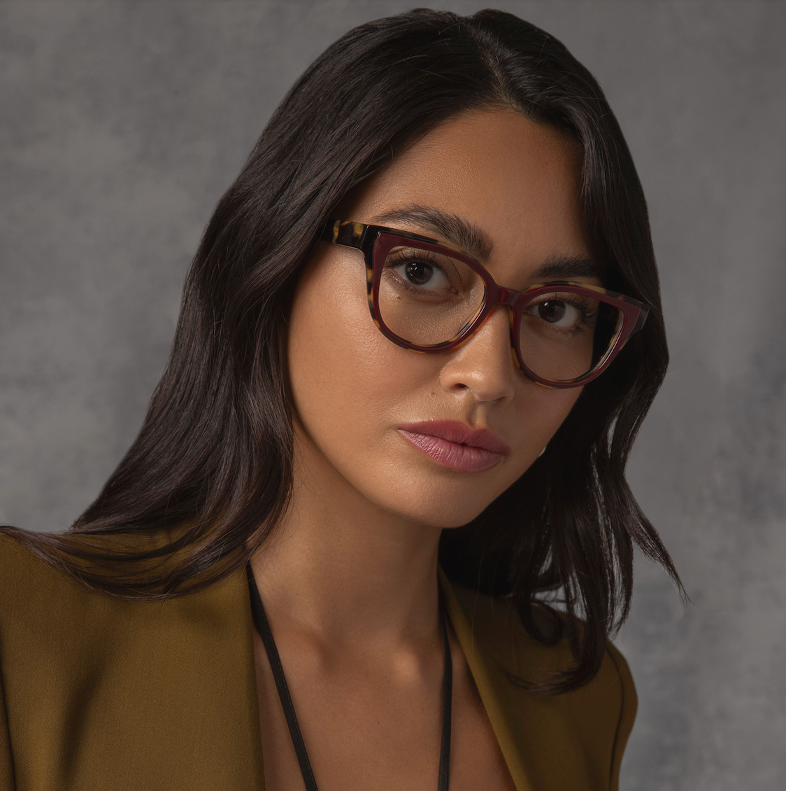 This bold and flirtatious cat-eye shape is impeccably crafted with an exposed laminate bevel. The unique custom laminate colors complement the flattering features of this feminine silhouette.
